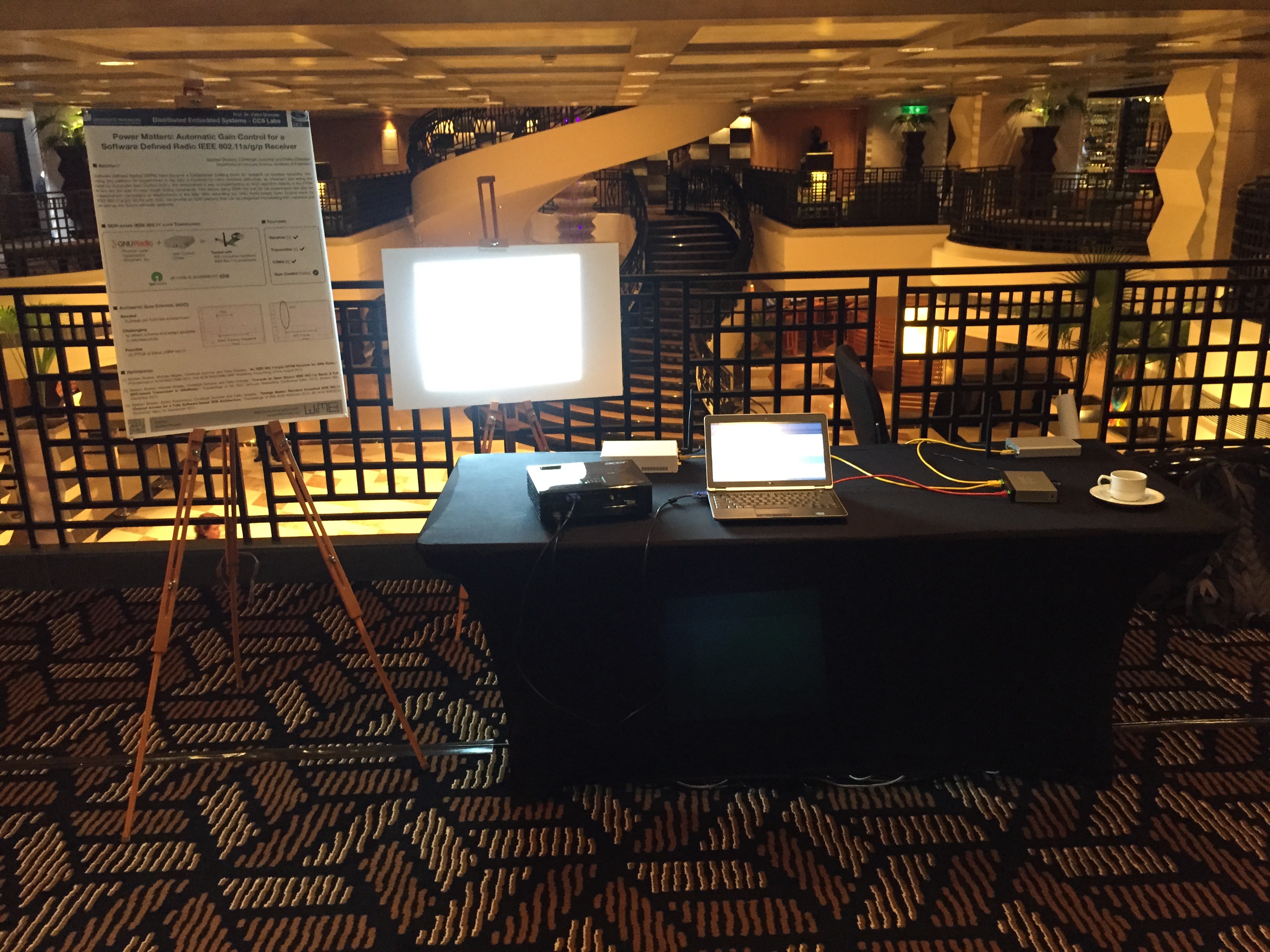 I took a projector with me to provide a good view on the outputs that visualize the WiFi signal at different stages of the decoding process. The demo was setup on a small floor between the rooms where the technical sessions were held. So I think it gained some good visibility, especially during the coffee break.