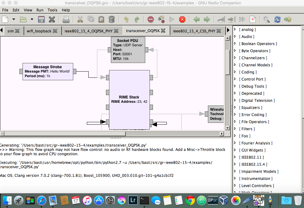 Yesterday, I started off fixing the unit tests of the GNU Radio ZigBee module, which were broken since the CSS phy got merged. However, opening the flow graphs in GNU Radio Companion, I soon realized that the module didn’t work at all on my Mac. (Whoot?!?)