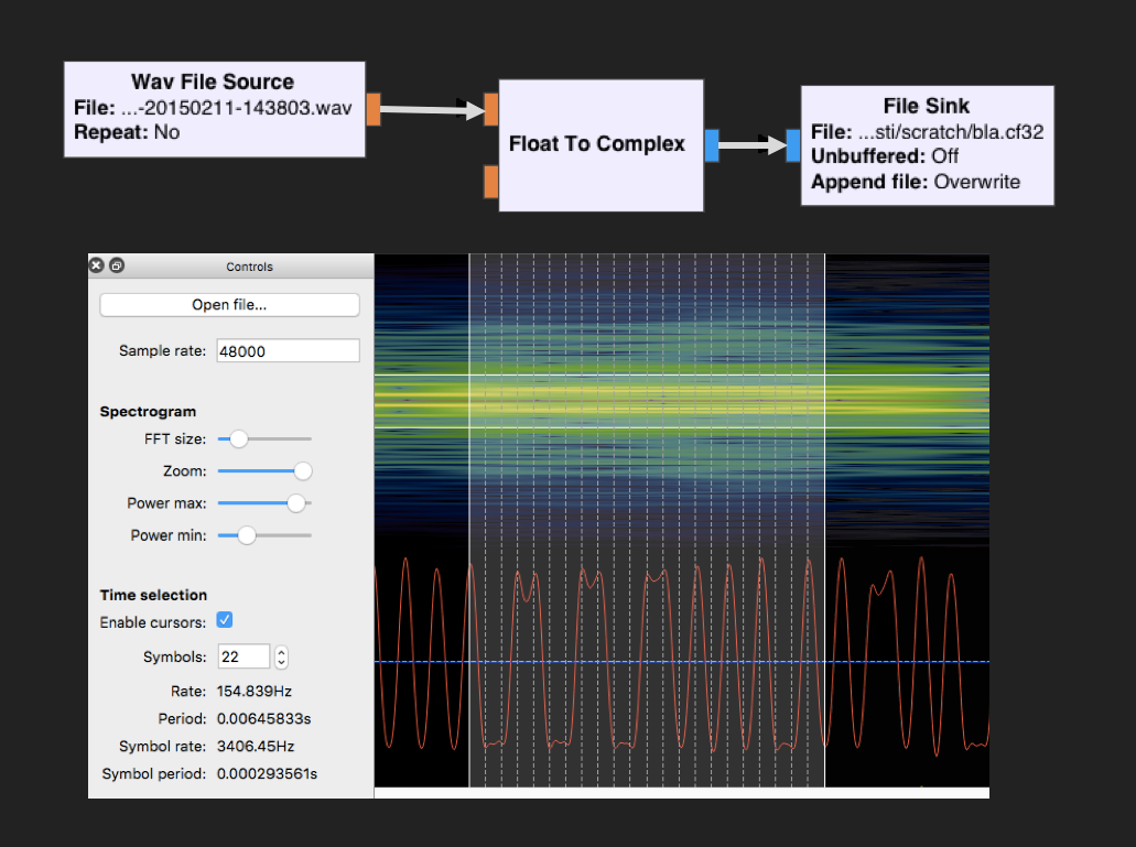 Compared to Baudline, Inspectrum might still lack some features, but since it’s an Open Source project, I’m quite positive that it will catch up soon. Inspectrum already provides a great unique feature: an overlay that allows to derive the symbol time easily. To use it together with GQRX, one just has to convert the WAV file to a complex signal, which can, for example, be done with a simple GNU Radio flow graph.