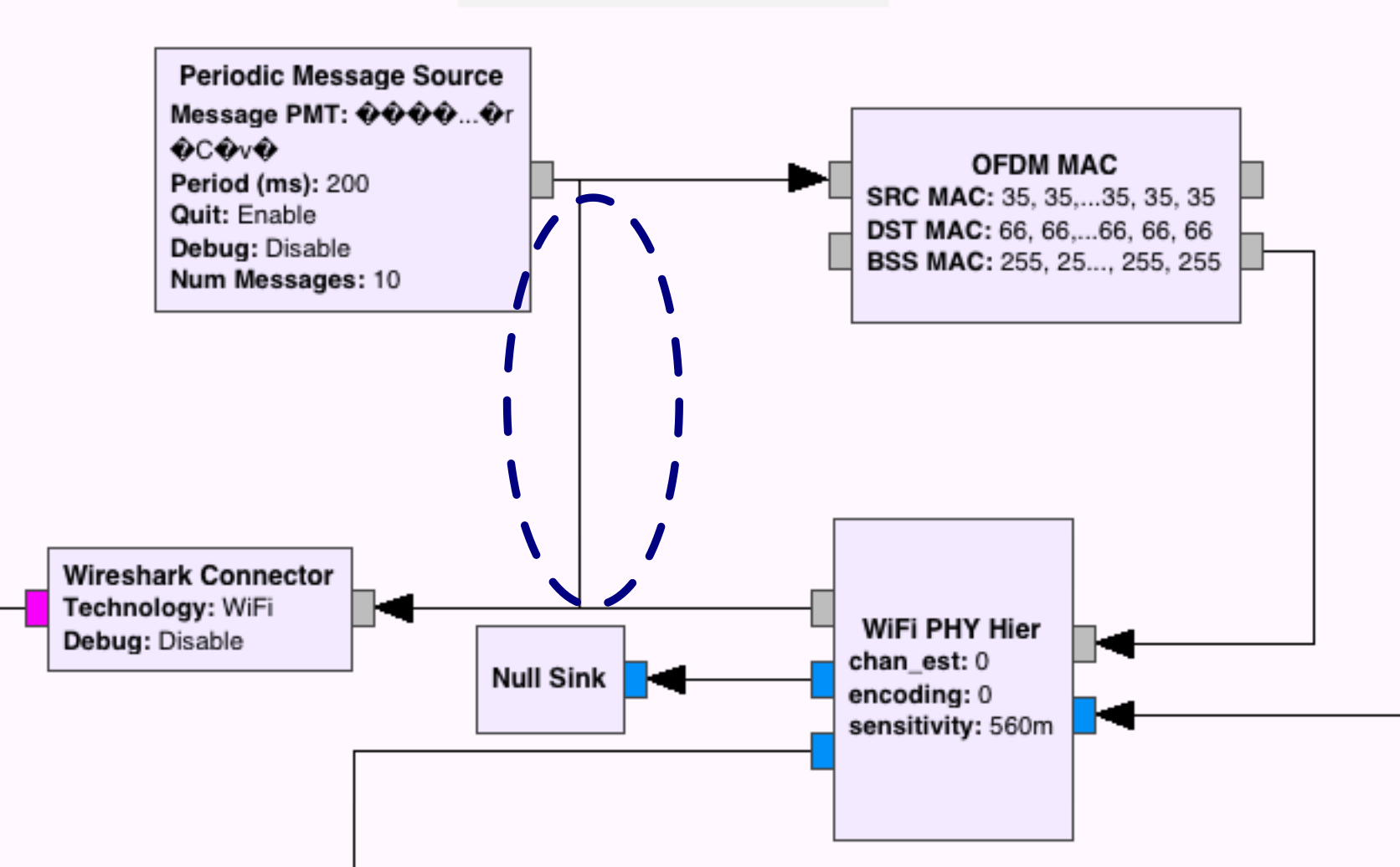 The first thing was to generate WiFi frames with a random payload. The WiFi transmitter expects PMTs (i.e., GNU Radio’s Polymorphic Message Type) as input, which can be produced with the Message Source block.