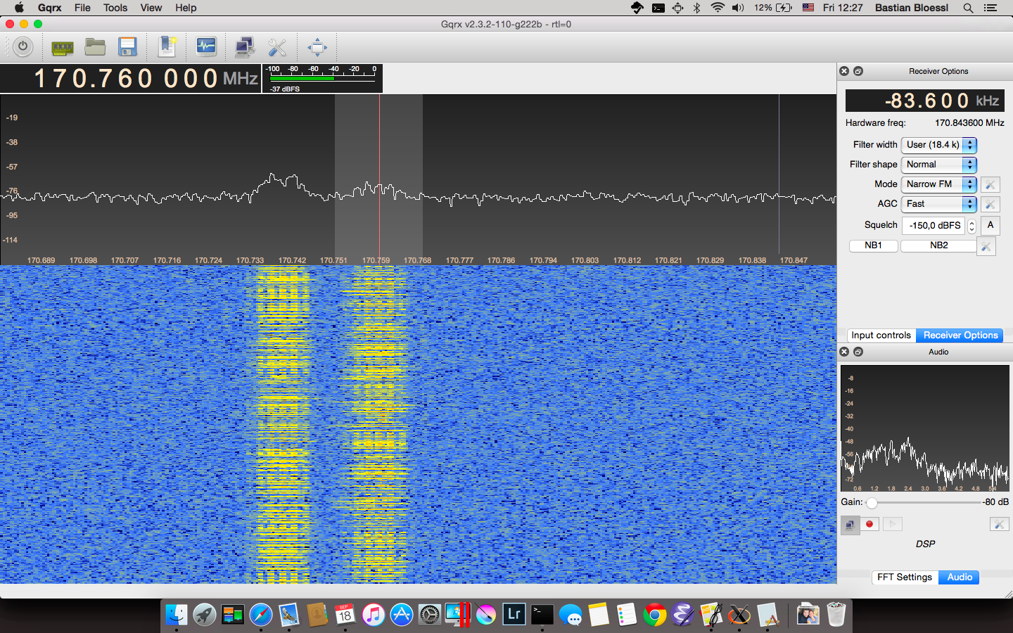 Of course, I wanted to have a look at the signal. I once heard that they transmit in the 2 meters band and that turned out to be true. With GQRX I found them at around 170MHz. The screenshot shows the two channels corresponding to the two pairs of traffic lights that operate independently.